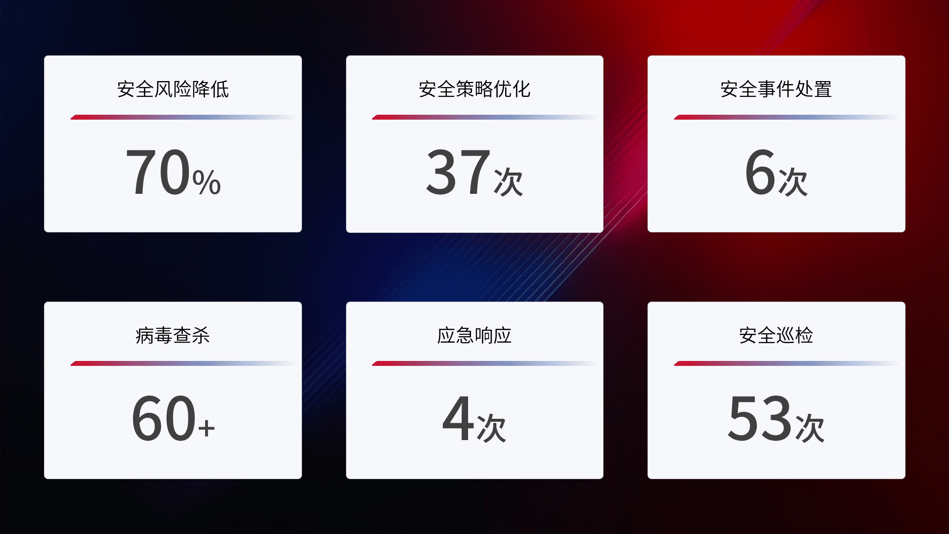 提供全面的安全事件报告体系,,,,包括处置报告、、、、周报、、、季度和年度总结,,,结合持续监控,,,,帮助客户深入了解网络安全状况。。。。